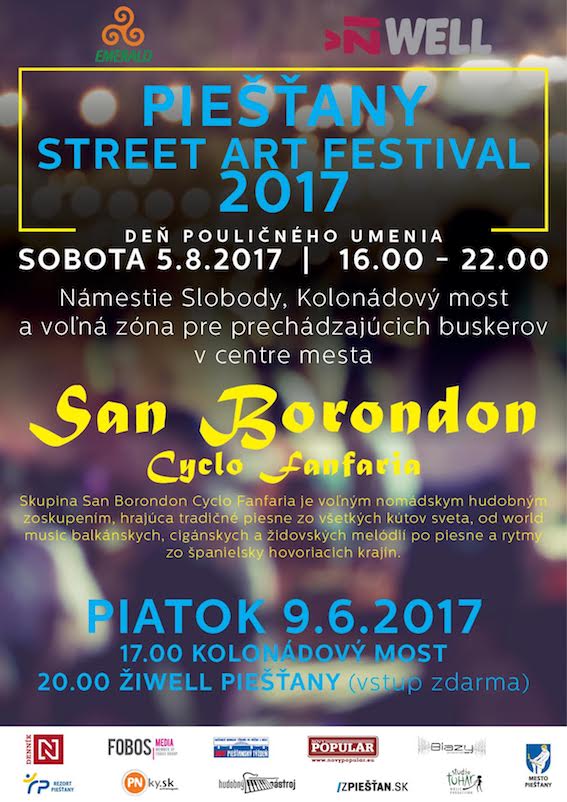 Koncertom kapely San Borondon Cyclo Fanfaria v piatok, 9.6.2017 o 17.00 na Kolonádovom moste a o 20.00 v klube ŽiWell „oficiálne“ otvárame sezónu pouličných umení v Piešťanoch. Koncert je súčasťou podujatia Piešťany Street Art Festival 2017 - Deň pouličného umenia, ktoré sa uskutoční dňa 5.8.2017.